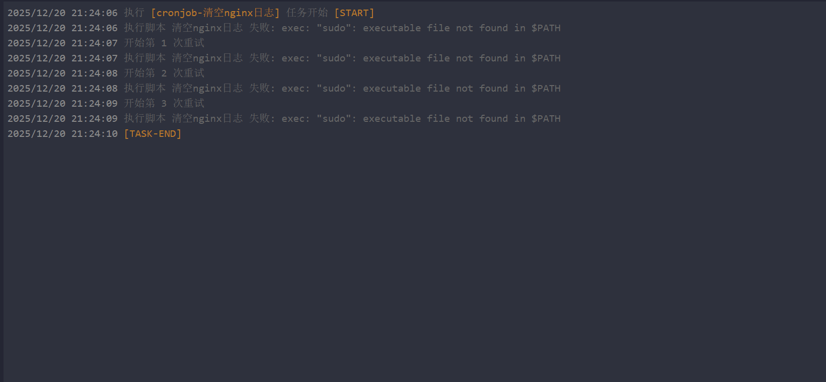 2025/12/20 21:24:06 执行 [cronjob-清空nginx日志] 任务开始 [START]