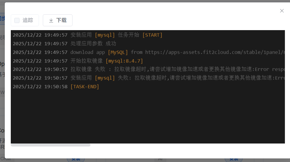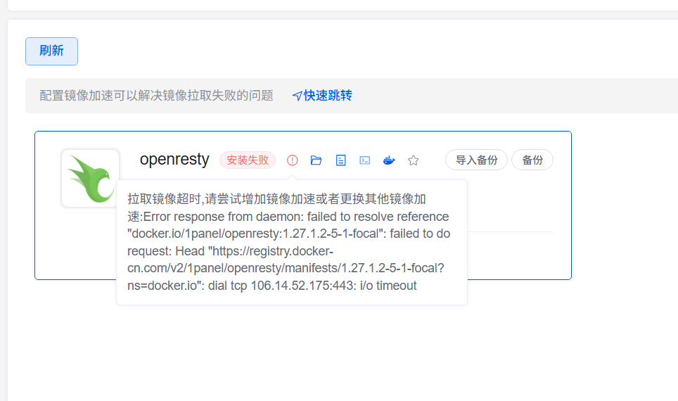 日志:拉取镜像超时,请尝试增加镜像加速或者更换其他镜像加速:Error response from daemon: failed to resolve reference “docker.io/1panel/openresty:1.27.1.2-5-1-focal”: failed to do request: Head “https://registry.docker-cn.com/v2/1panel/openresty/manifests/1.27.1.2-5-1-focal?ns=docker.io”: dial tcp 106.14.52.175:443: i/o timeout