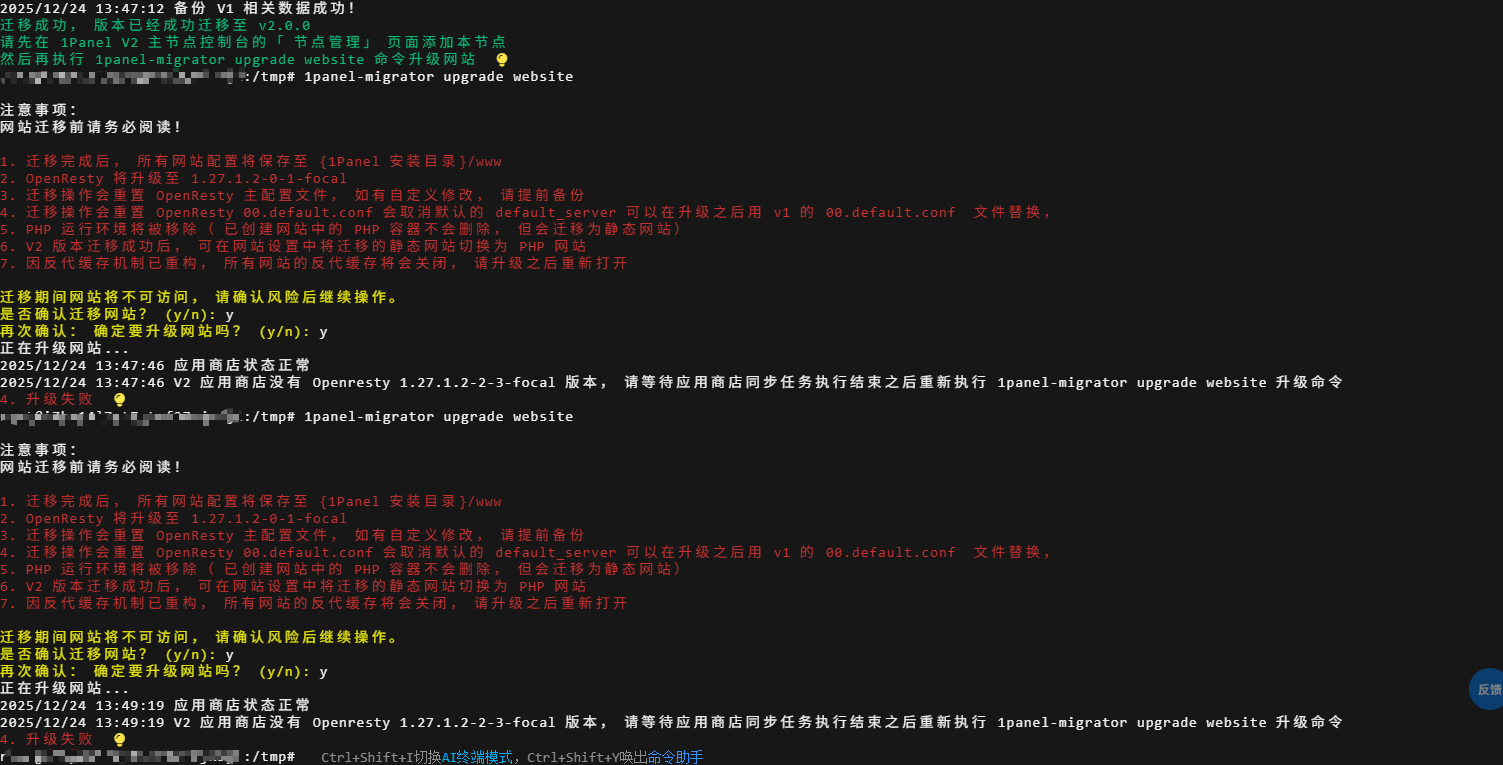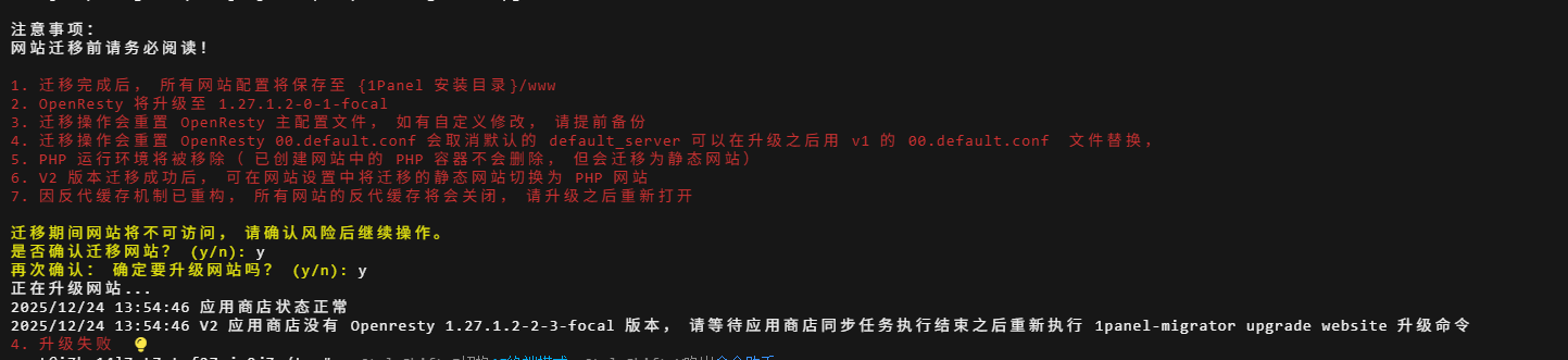 2025/12/24 13:49:19 V2 应用商店没有 Openresty 1.27.1.2-2-3-focal 版本,请等待应用商店同步任务执行结束之后重新执行 1panel-migrator upgrade website 升级命令