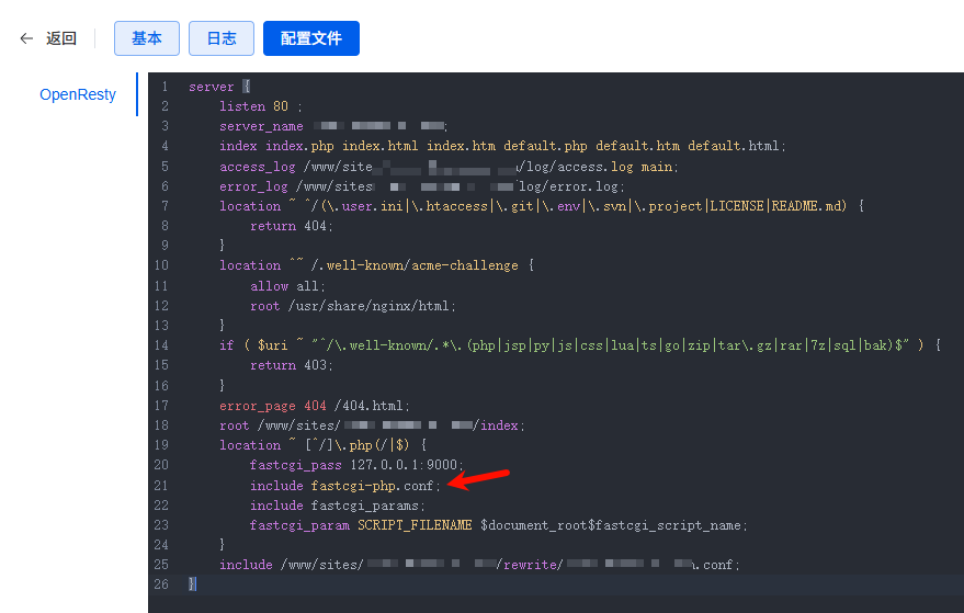 经过排查 发现问题出现在 1Panel 自带的 fastcgi-php.conf 上这个文件上,如图 21 行。