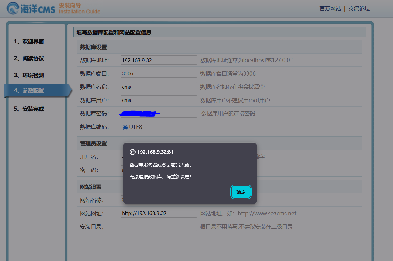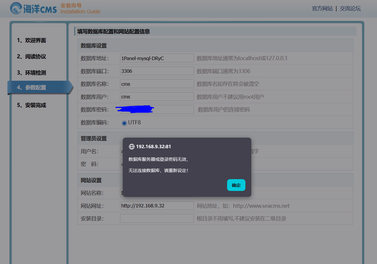把海洋cms的文件丢进网站目录下。自己在docker搭建了nginx+php+mysql可以成功连接到数据库,但网站页面多多少少有点问题,还是需要1panel建站方便