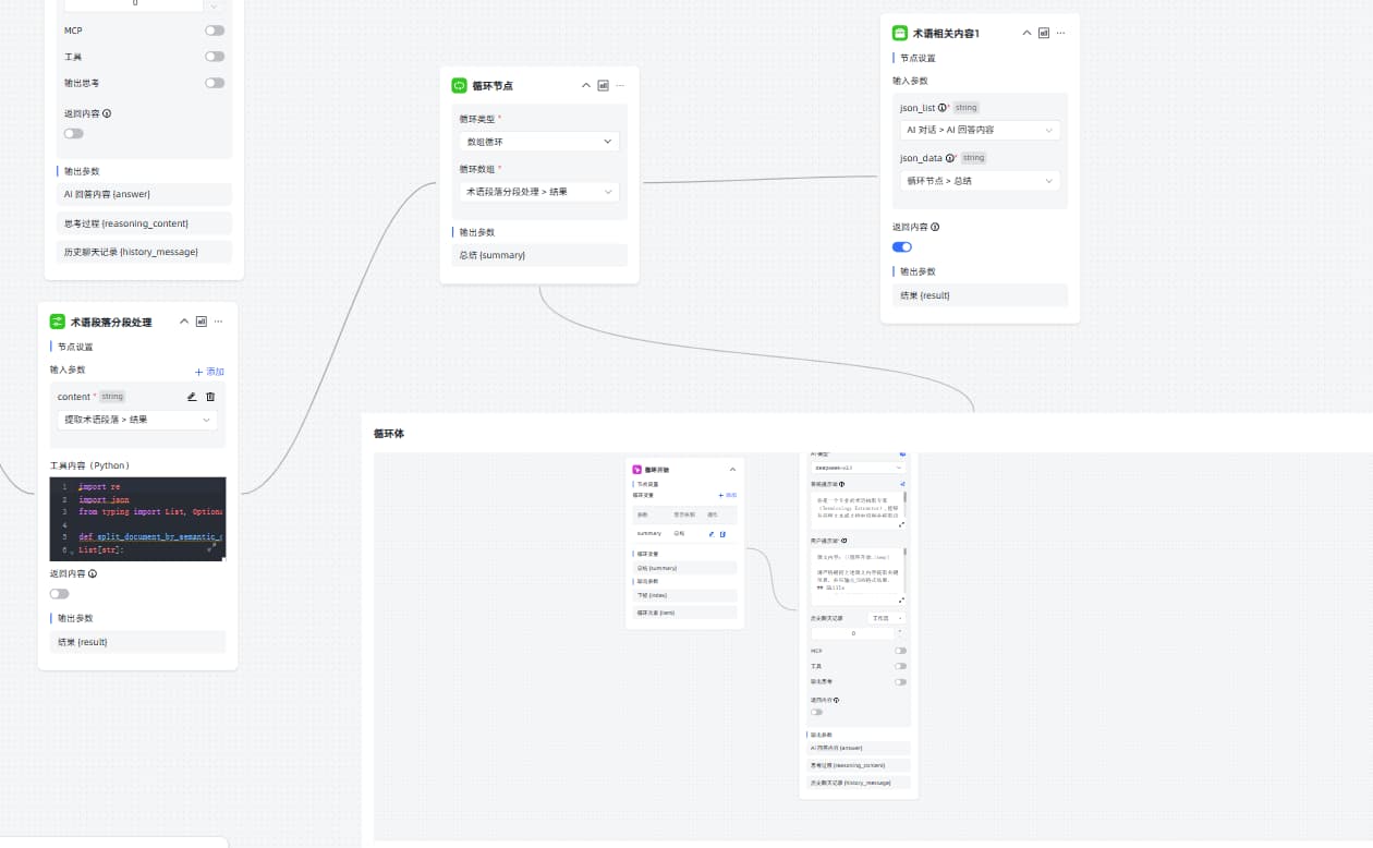 各位大佬们,图片中我使用术语段落分段这个节点将段落进行分段,然后输出的是[“XX”,“VVV”,…]这样的,然后使用循环节点,遍历每一个索引的内容进入循环体来处理内容,最后再将内容合并起来在术语相关内容节点输出,这样的工作流怎么设计?