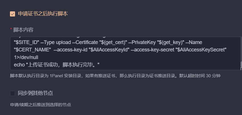 我的想法是当这个证书自动续签后,利用脚本自动上传更新阿里云的证书,脚本我是测试可以的,但是这个自动续签后脚本执行什么情况我根本不知道。。。 1.它的日志在哪儿看?还是说压根没有日志 2.这个脚本管理是真的麻烦,不管是编辑还是测试
