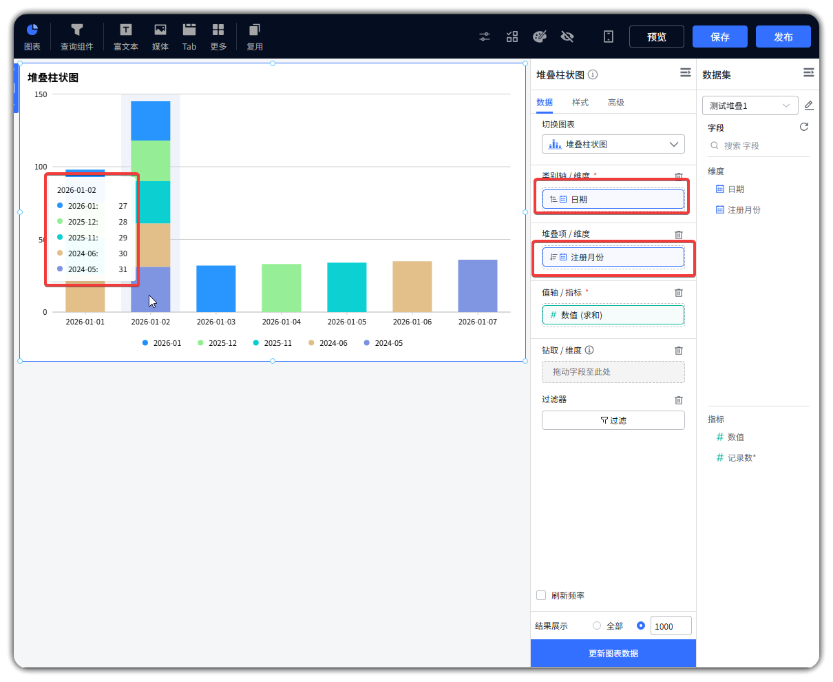 操作:将横轴(日期)设置为升序排列(日期从早到晚),同时将堆叠项(注册月份)设置为降序排列(注册月份从新到旧,如 2026-01 > 2025-12 > 2024-06)。 预期:每个日期对应的柱状图内,堆叠项按 “最新注册月份在上、最旧在下” 的顺序排列。