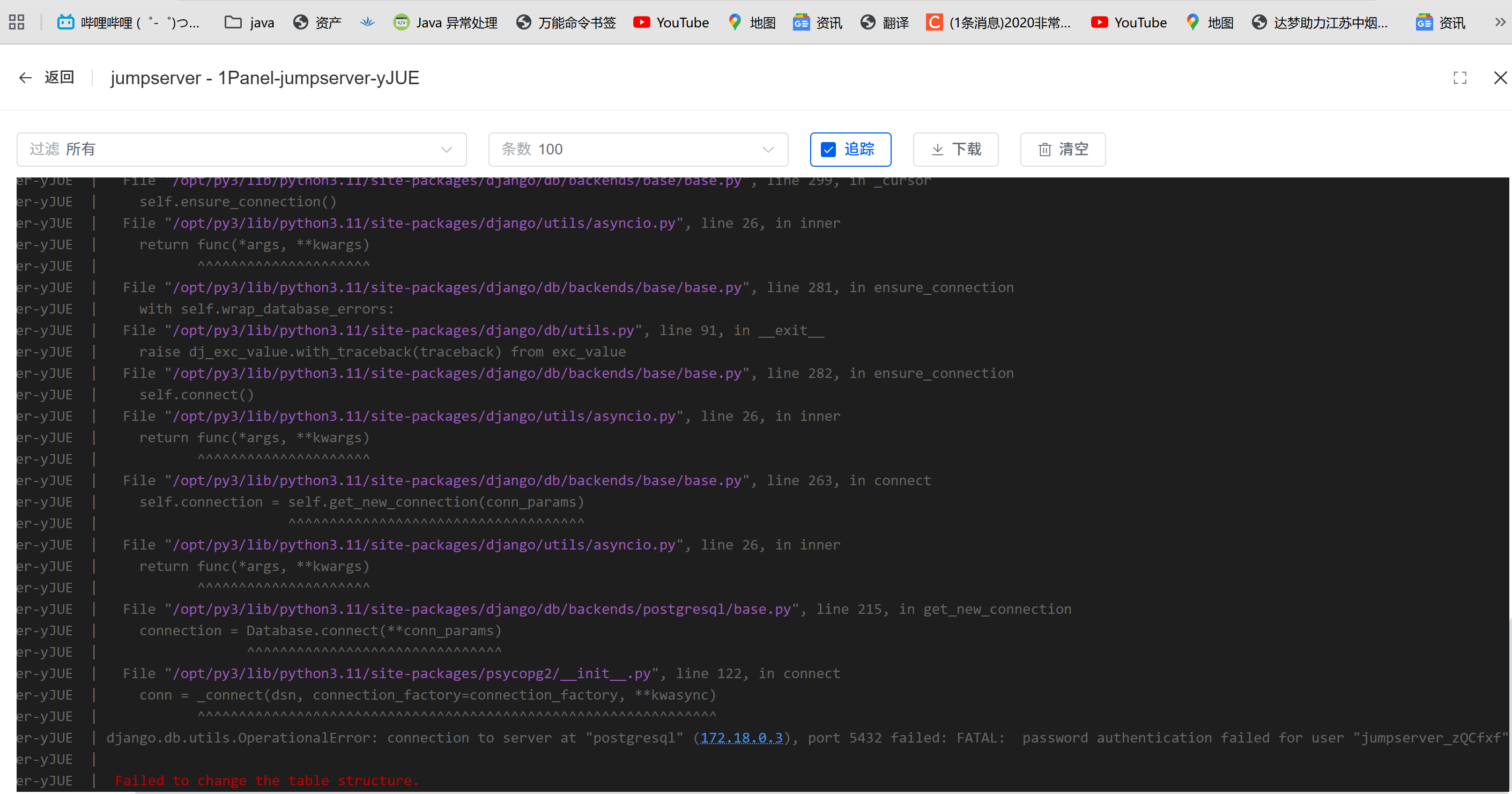 jumpserver版本4.10.12 1Panel版本2.0.16 pg数据库版本18.0-alpine(数据库连接正常)