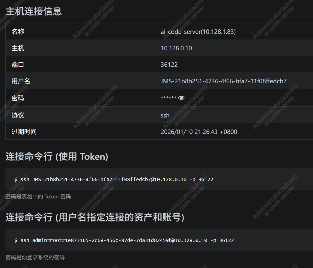 在连接资产时,选择SSH向导,会给出使用ssh直接登录的方式,如图所示。