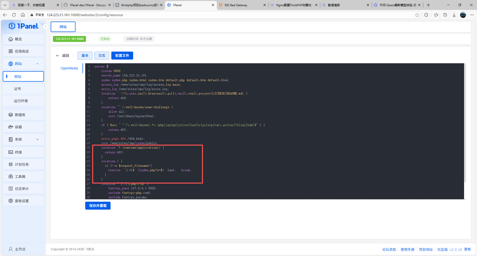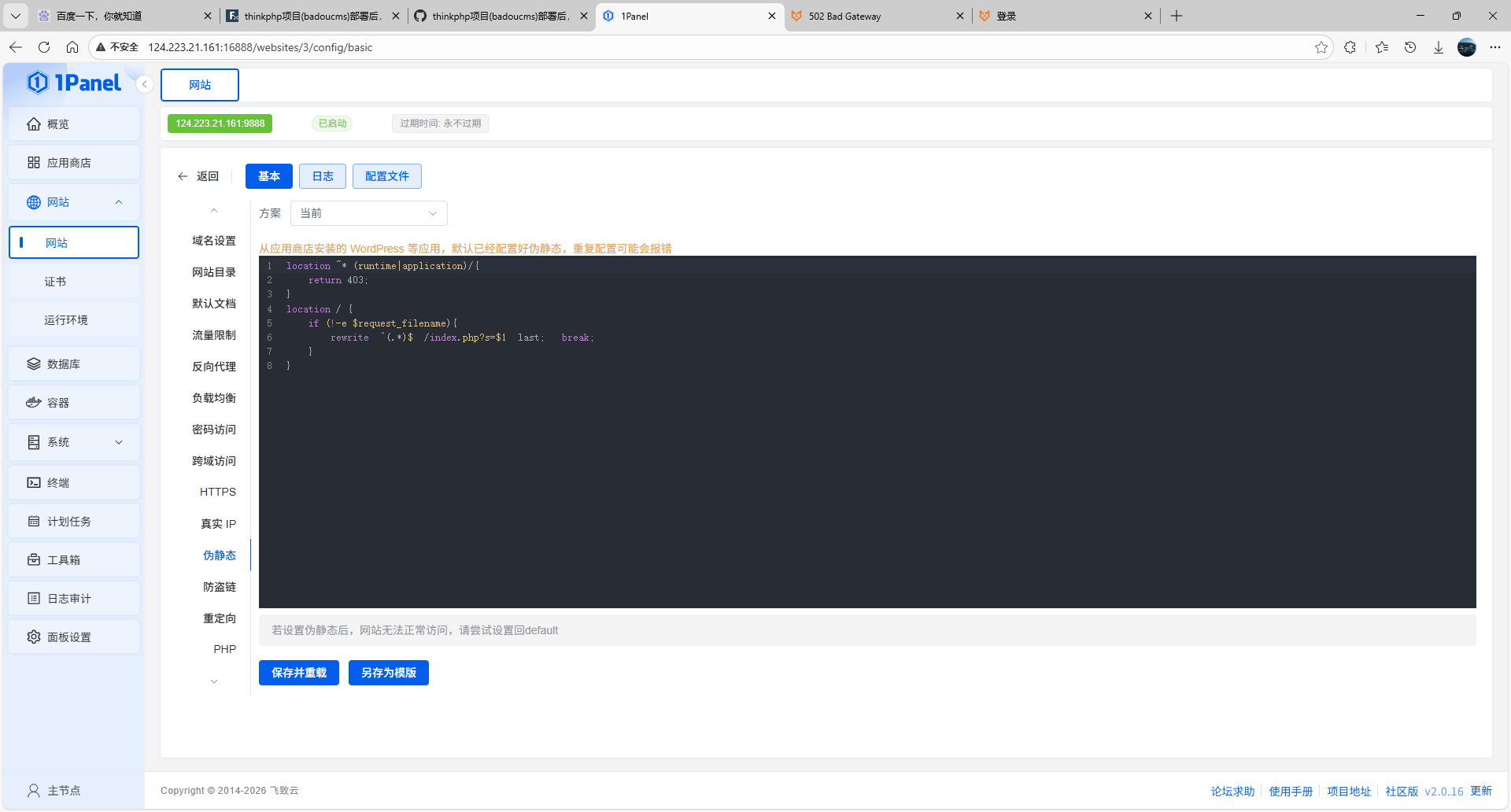 现在有另一个问题,访问/admin.php后台时,1panel会一直循环重定向,宝塔则不会