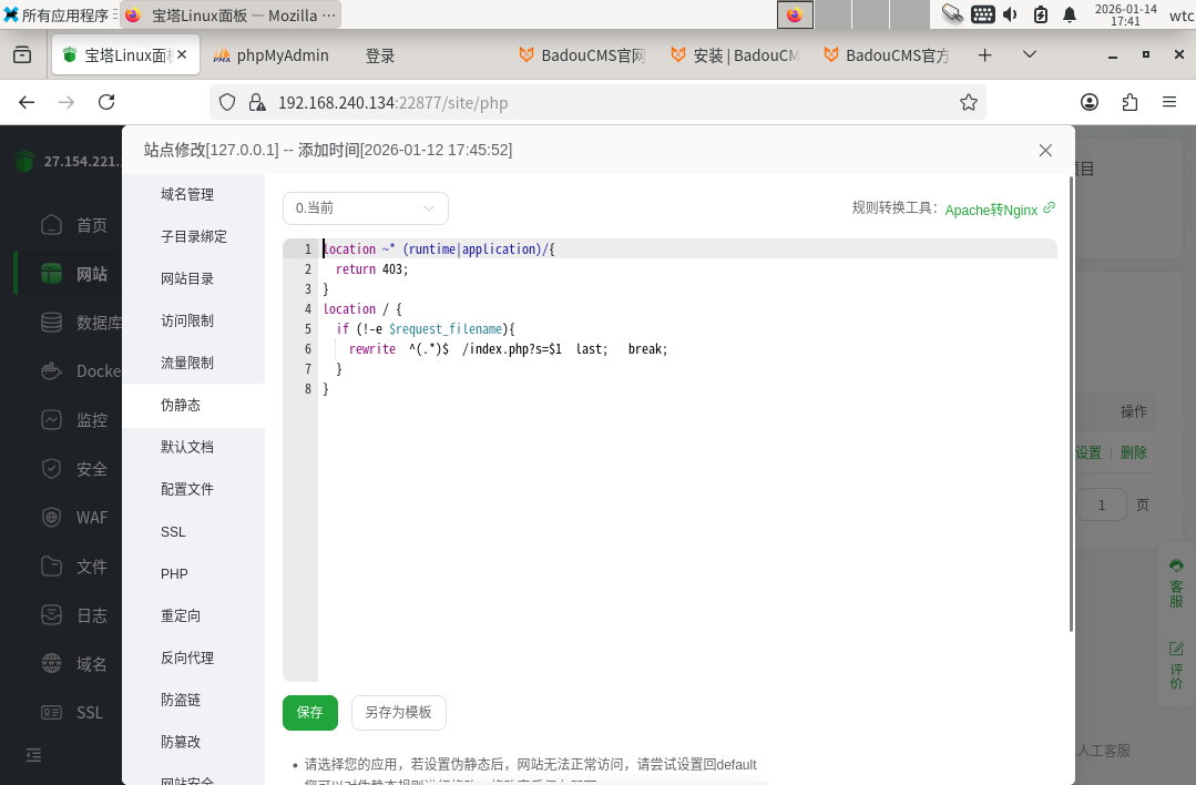 badoucms使用1panel部署后,设置完伪静态和运行目录,显示File not found,在vmware使用宝塔面板安装部署则可正常访问