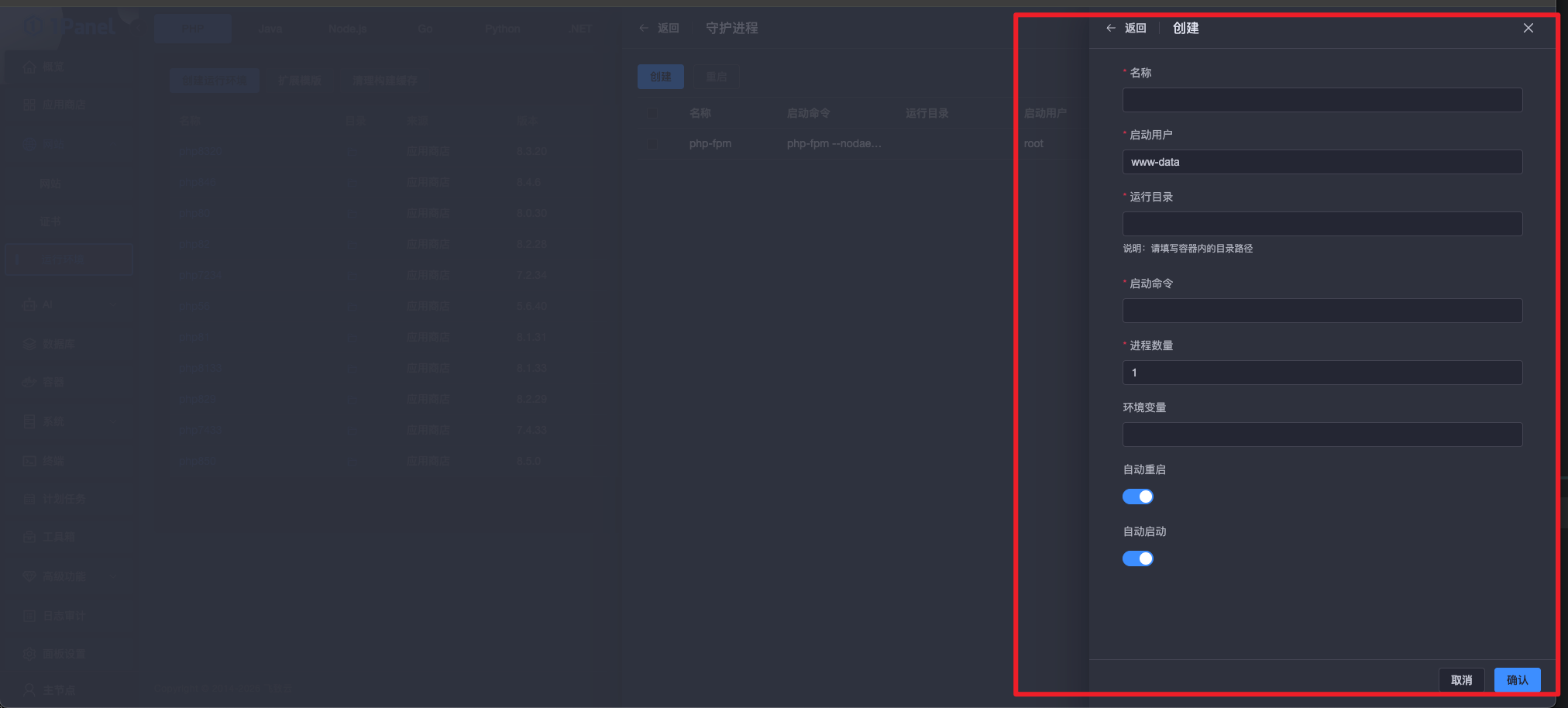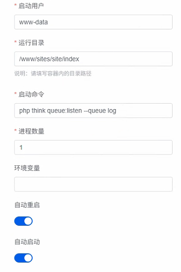 框架就是fastadmin,目前是这样设置的,我在面板的网站=>运行环境,容器是php7.4,点击的更多,进程守护添加的执行命令行