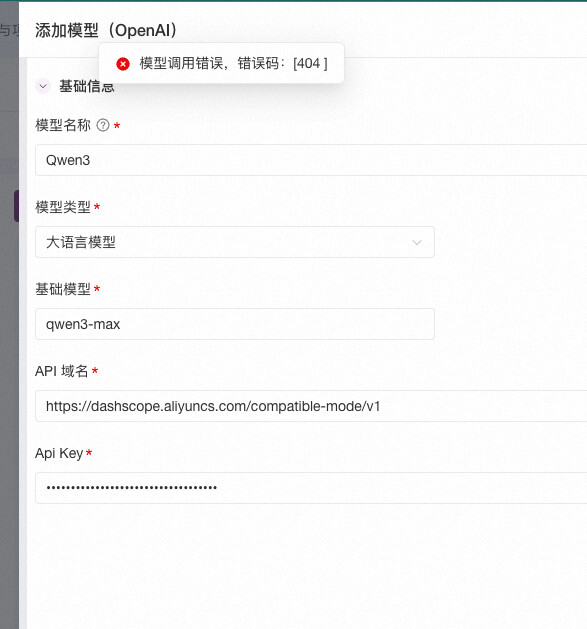社区版v3.6.7-lts-da0f7c8a,添加百炼模型,报模型调用错误,错误码:[404 ]
