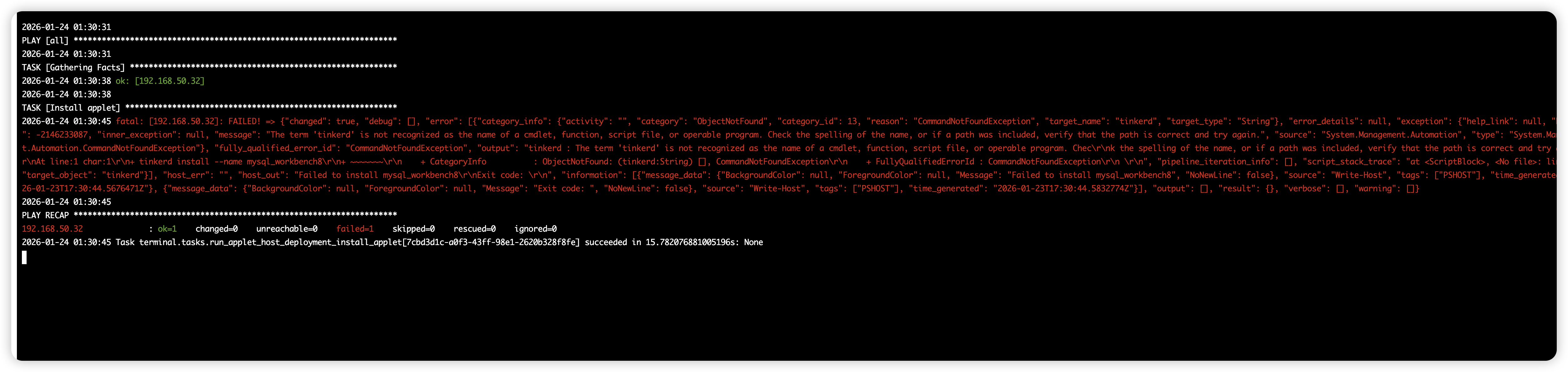 2026-01-24 01:30:45 fatal: [192.168.50.32]: FAILED! => {“changed”: true, “debug”: [], “error”: [{“category_info”: {“activity”: “”, “category”: “ObjectNotFound”, “category_id”: 13, “reason”: “CommandNotFoundException”, “target_name”: “tinkerd”, “target_type”: “String”}, “error_details”: null, “exception”: {“help_link”: null, “hresult”: -2146233087, “inner_exception”: null, “message”: “The term ‘tinkerd’ is not recognized as the name of a cmdlet, function, script file, or operable program. Check the spelling of the name, or if a path was included, verify that the path is correct and try again.”, “source”: “System.Management.Automation”, “type”: “System.Management.Automation.CommandNotFoundException”}, “fully_qualified_error_id”: “CommandNotFoundException”, “output”: “tinkerd : The term ‘tinkerd’ is not recognized as the name of a cmdlet, function, script file, or operable program. Chec\r\nk the spelling of the name, or if a path was included, verify that the path is correct and try again.\r\nAt line:1 char:1\r\n+ tinkerd install --name mysql_workbench8\r\n+ ~~~~~~~\r\n + CategoryInfo : ObjectNotFound: (tinkerd:String) [], CommandNotFoundException\r\n + FullyQualifiedErrorId : CommandNotFoundException\r\n \r\n”, “pipeline_iteration_info”: [], “script_stack_trace”: “at , : line 1”,“target_object”: “tinkerd”}], “host_err”: “”, “host_out”: “Failed to install mysql_workbench8\r\nExit code: \r\n”, “information”: [{“message_data”: {“BackgroundColor”: null, “ForegroundColor”: null, “Message”: “Failed to install mysql_workbench8”, “NoNewLine”: false}, “source”: “Write-Host”, “tags”: [“PSHOST”], “time_generated”: “2026-01-23T17:30:44.5676471Z”}, {“message_data”: {“BackgroundColor”: null, “ForegroundColor”: null, “Message”: "Exit code: ", “NoNewLine”: false}, “source”: “Write-Host”, “tags”: [“PSHOST”], “time_generated”: “2026-01-23T17:30:44.5832774Z”}], “output”: [], “result”: {}, “verbose”: [], “warning”: []}