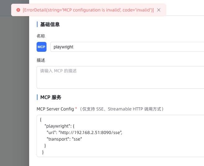 但是在配置mcp的时候,怎么配置无论是sse,还是http,或者改成/sse 都是报错:[ErrorDetail(string=‘MCP configuration is invalid’, code=‘invalid’)]