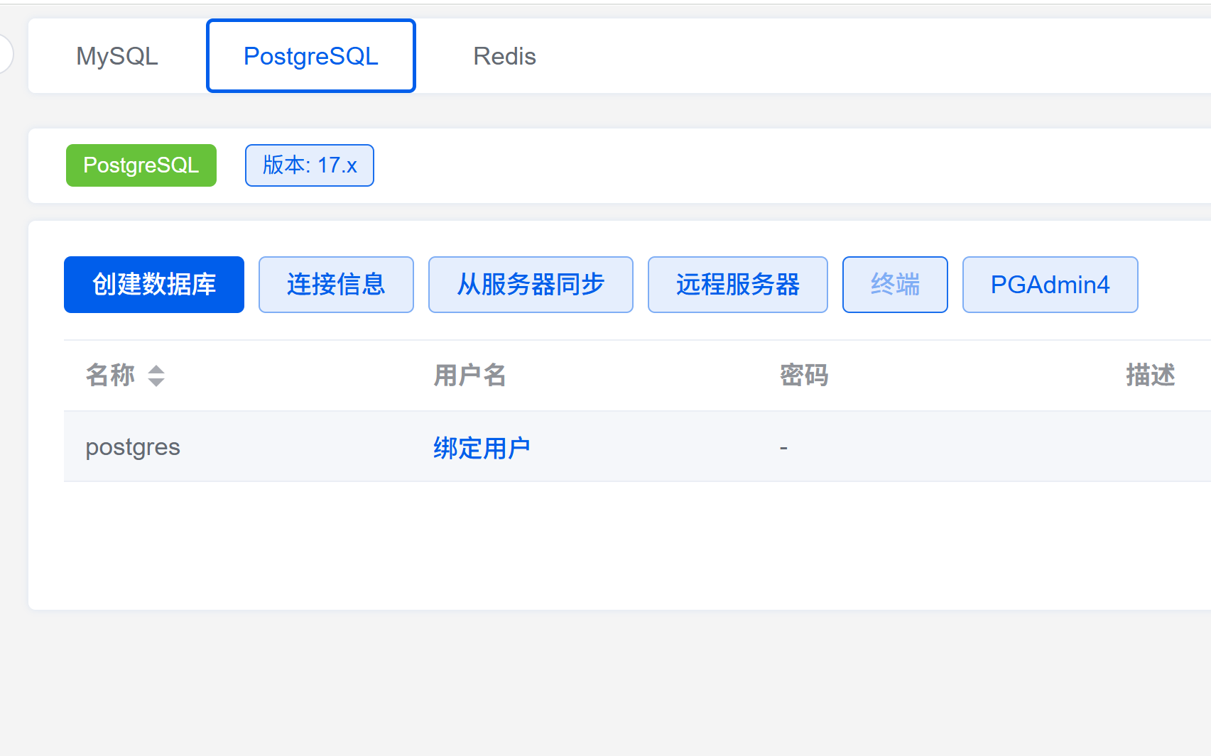 描述:1panel postgresql 远程服务器使用的与 DataGrip 为同一个账户只能看到一个 postgres 数据库,但是 DataGrip 就可以看到另外一个创建的数据库,使用从服务器同步无法成功同步 1Panel 版本:社区版 v2.0.17 操作系统(设备): Windows11 关键截图: