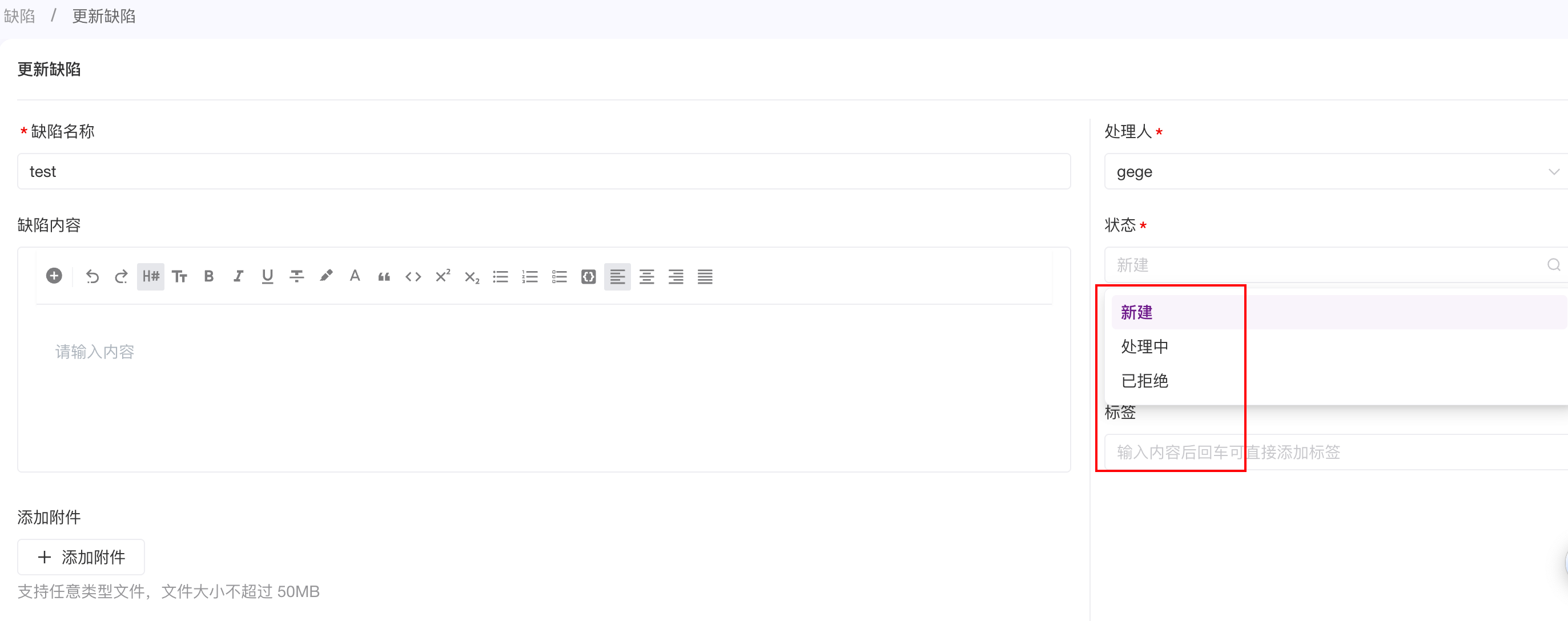 更新缺陷时,没有已关闭、已解决状态