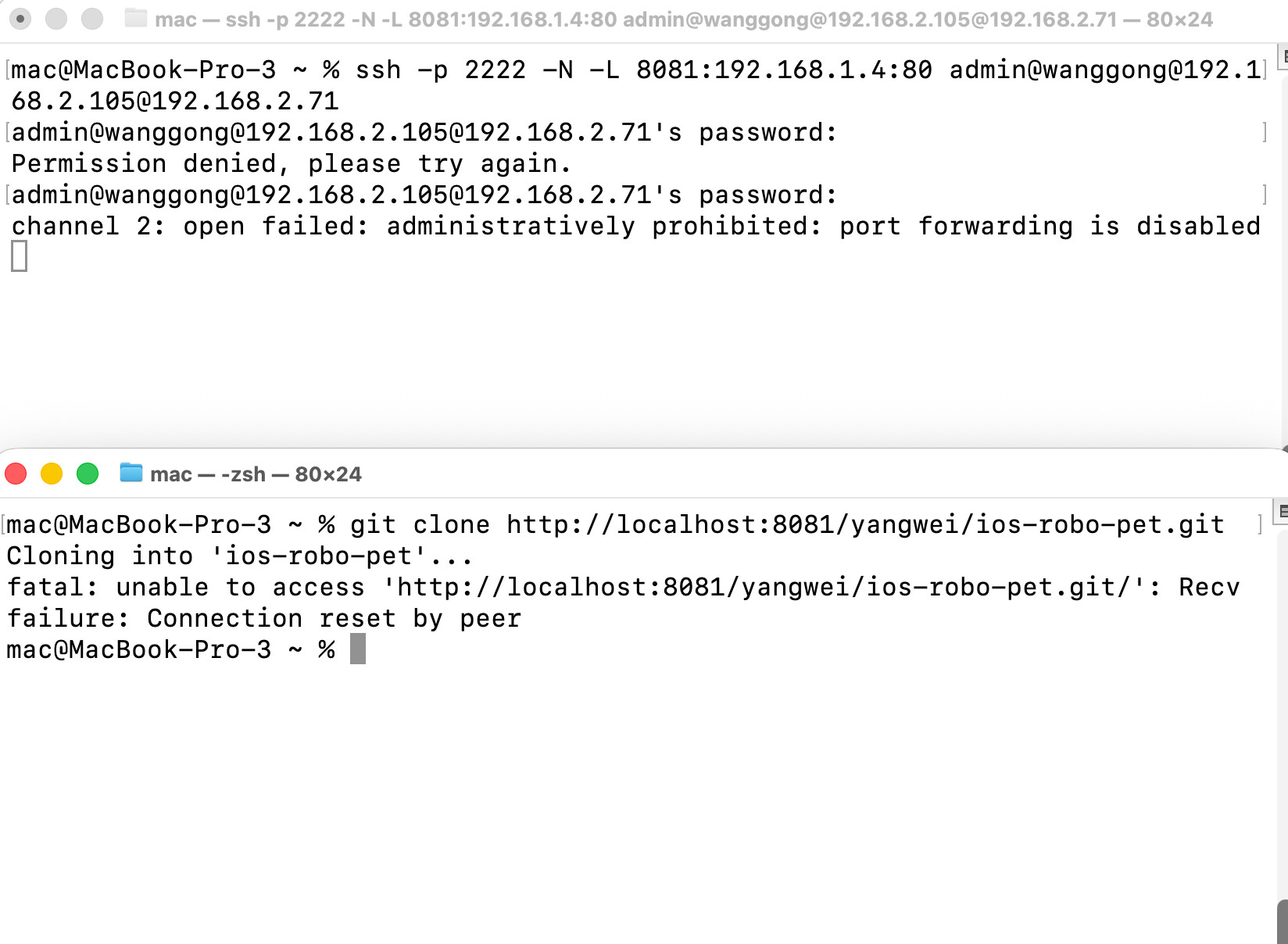 ssh -p 2222 -N -L 8081:192.168.1.4:80 admin@wanggong@192.168.2.105@192.168.2.71中用户名部分可能存在拼接错误,正确格式应为用户名@资产IP,建议使用标准格式:
