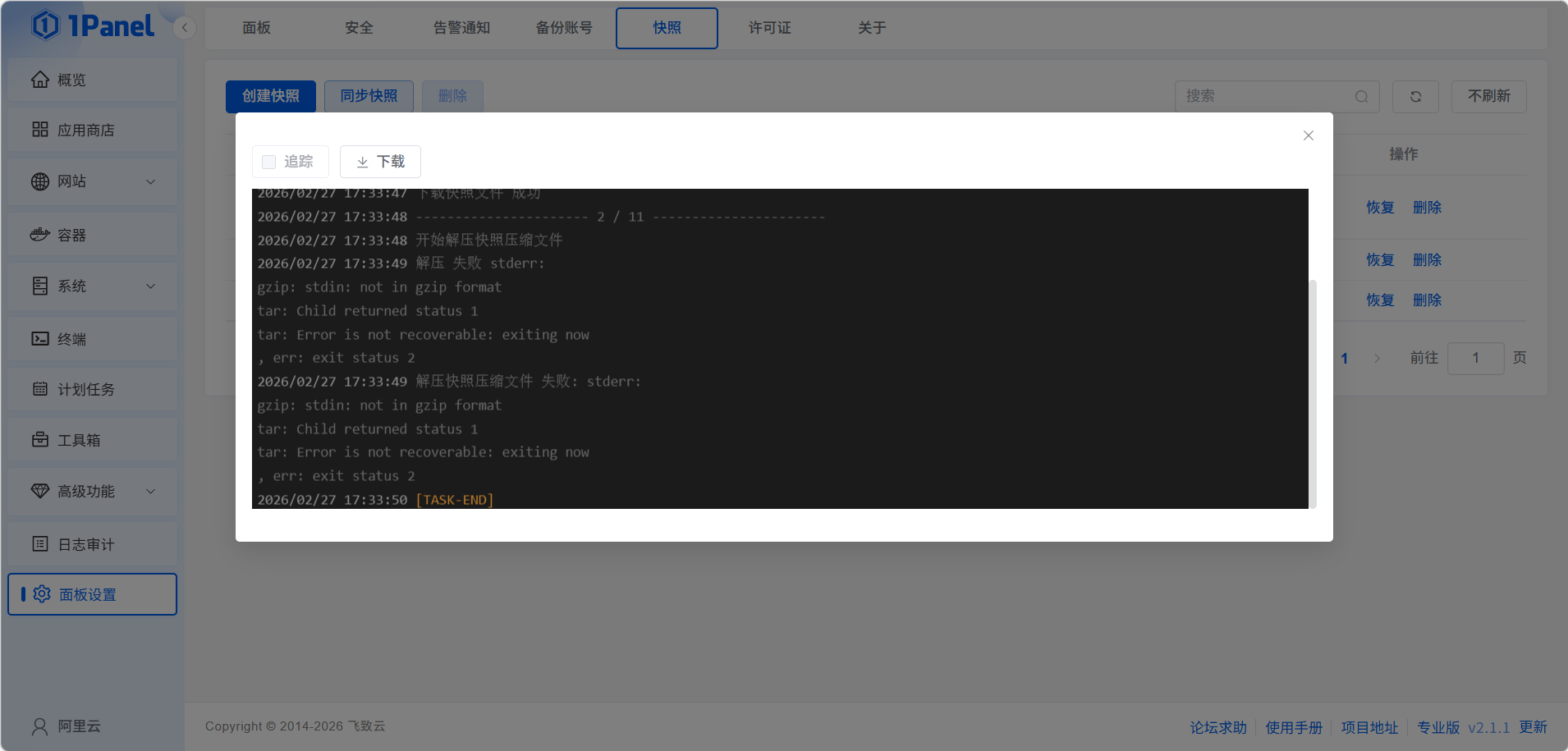 2026/02/27 17:33:38 恢复快照 [snapshot-1panel-core-v2.1.1-linux-amd64-20260227023000pg1ru] 任务开始 [START]