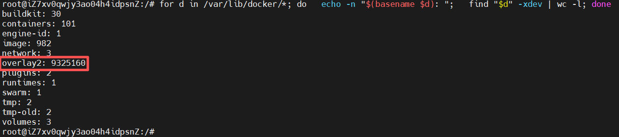 经过扫描,发现overlay2目录的文件数量达930万之多,如下图: