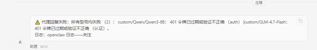 利用自定义创建模型账号了 但是在配置模型后 openclaw页面显示401令牌过期
