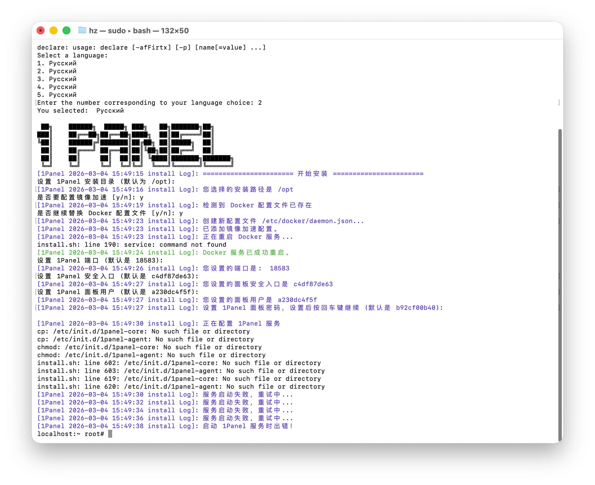 在MacBook Pro M1芯片版电脑上安装1panel时,显示cp: /etc/init.d/1panel-core: No such file or directory;无法完成安装是什么原因?