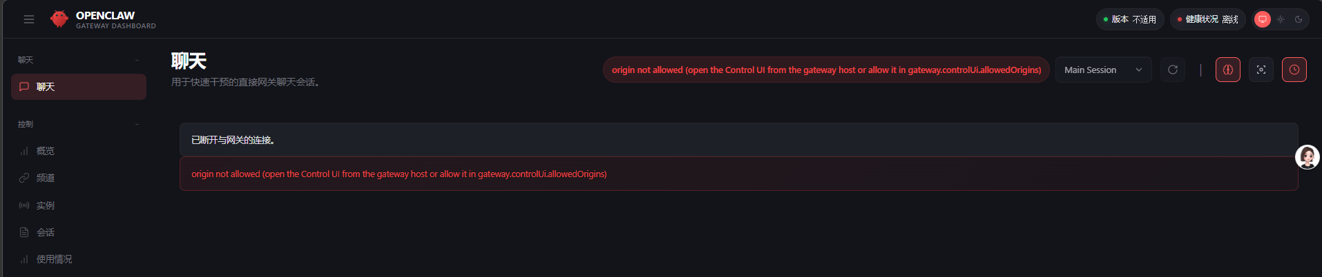 使用1panel AI模块部署智能体 报错:origin not allowed (open the Control UI from the gateway host or allow it in gateway.controlUi.allowedOrigins) Sessions