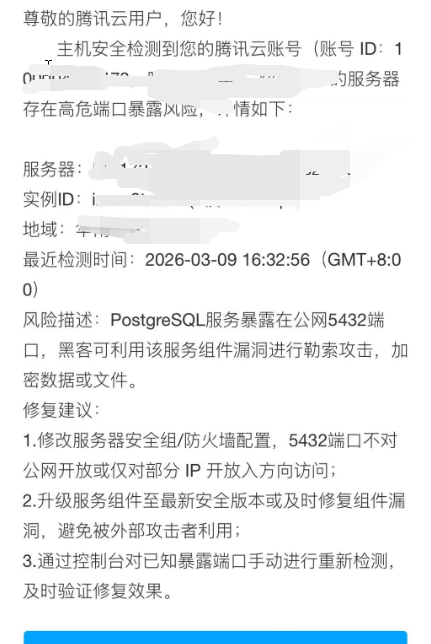 腾讯云邮件说这个1panel开放的5432端口暴露公网,我想确认危险程度怎么样,我从豆包建议是说把公网ip改为仅限服务器内网访问,但是服务提供方硕这样改可能造成应用无法正常运行,