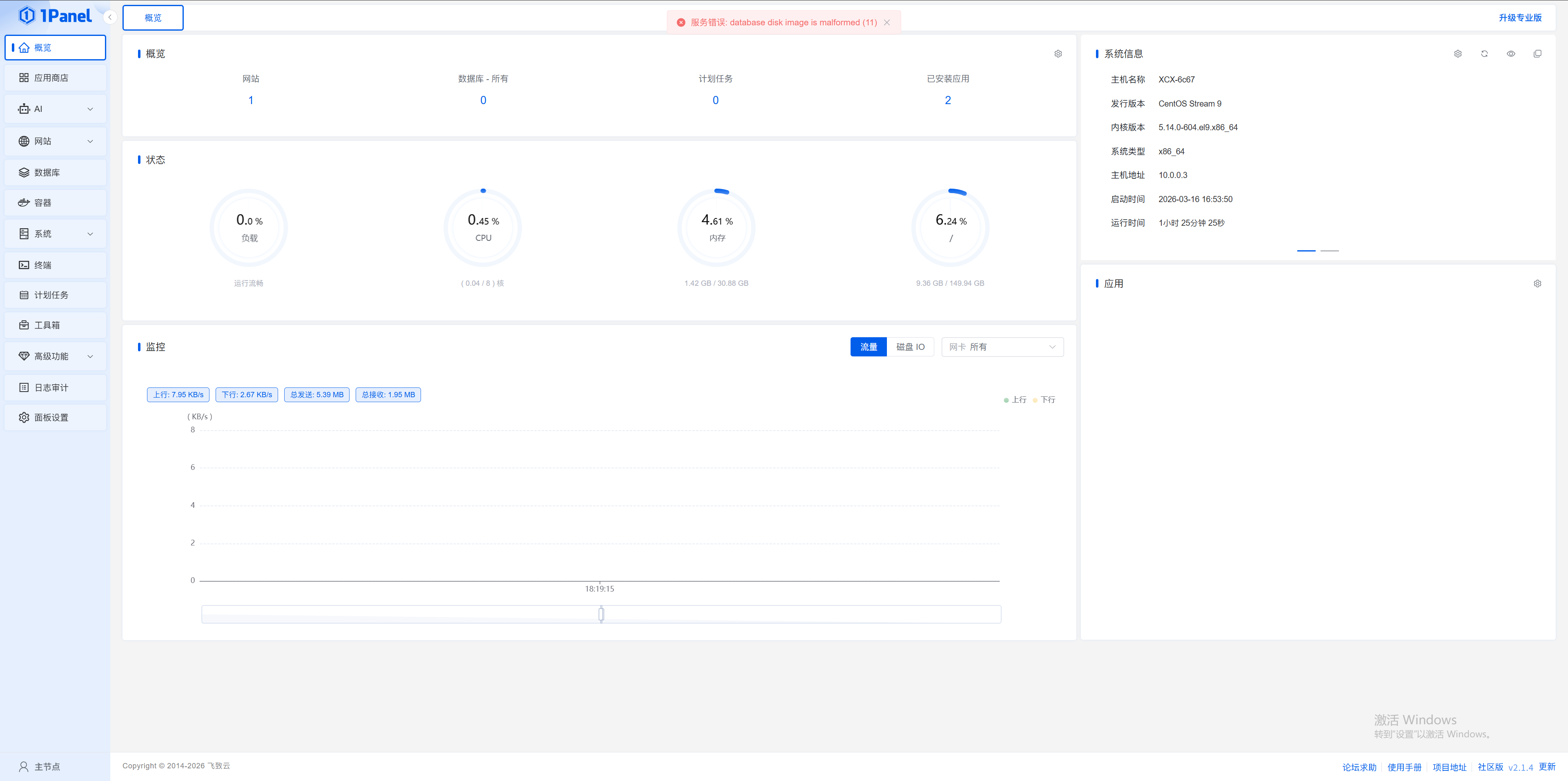 装完面板2天后,再次打开,提示服务错误: database disk image is malformed (11),数据库无法打开,容器显示数据库服务正常,网站无法配置