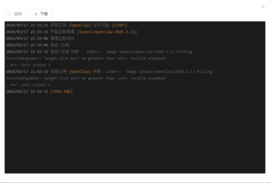 2026/03/17 21:42:32 安装应用 [OpenClaw] 失败: stderr: Image 1panel/openclaw:2026.3.13 Pulling