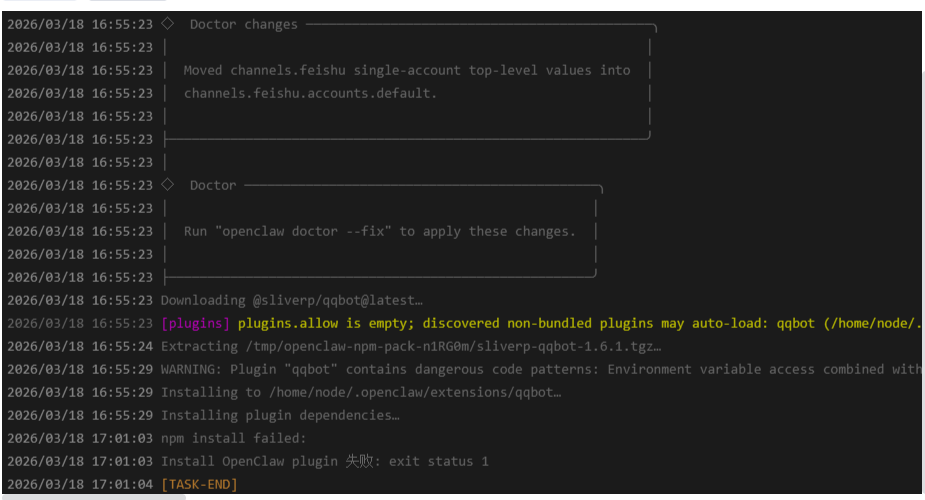 2026/03/18 17:01:03 Install OpenClaw plugin 失败: exit status 1