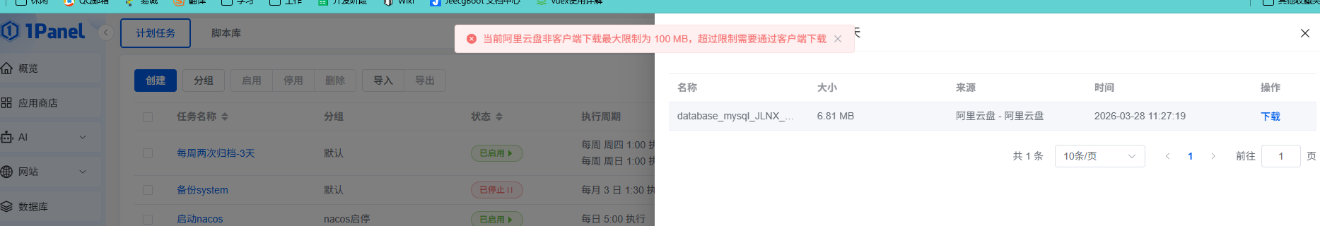 当前阿里云盘非客户端下载最大限制为 100 MB,超过限制需要通过客户端下载