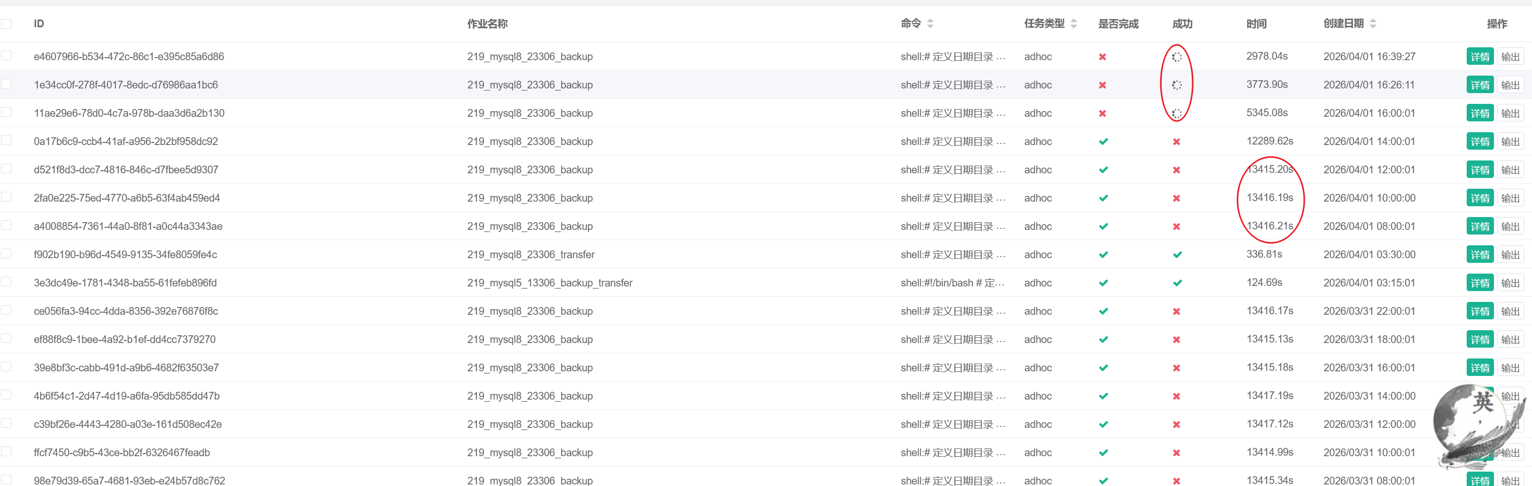 作业中心添加的定时备份数据库任务一直在转圈,直到超过13414秒左右自己超时,开始我以为是备份失败了一直在超时,我在备份脚本添加了日志,将错误输出到日志文件,查看日志文件发现并没有错误,