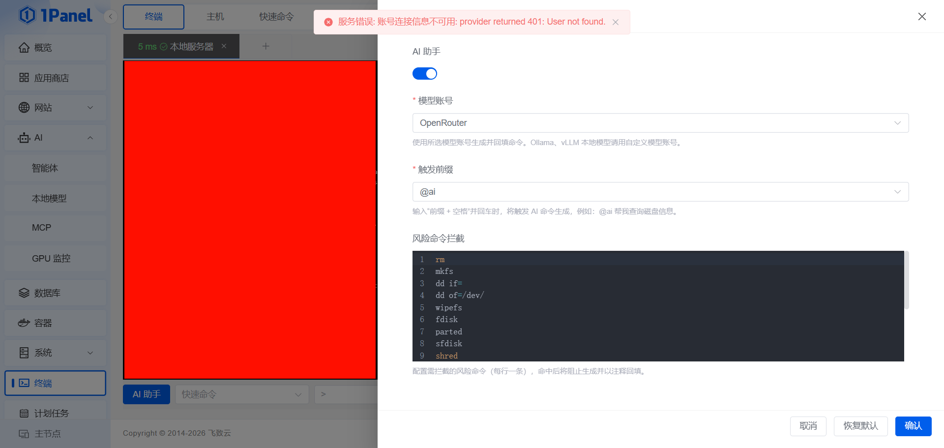 在终端>AI 助手中 启用AI助手时出错: