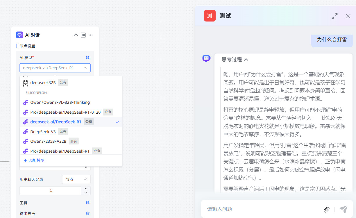 首先我使用硅基流动调用API方式使用大模型时,可以正确地显示思考过程