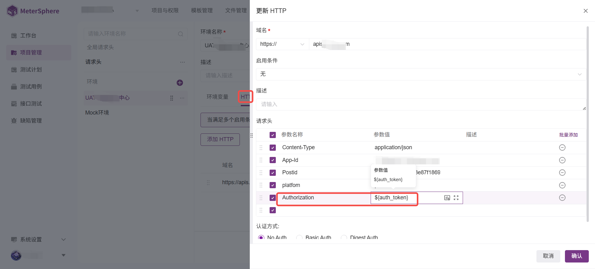 2、在环境的http接口编辑页面,引用这个token