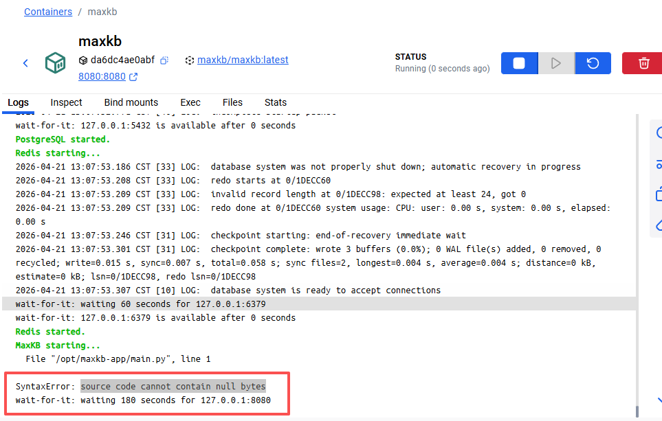 我的maxkb为什么启动镜像出现source code cannot contain null bytes
