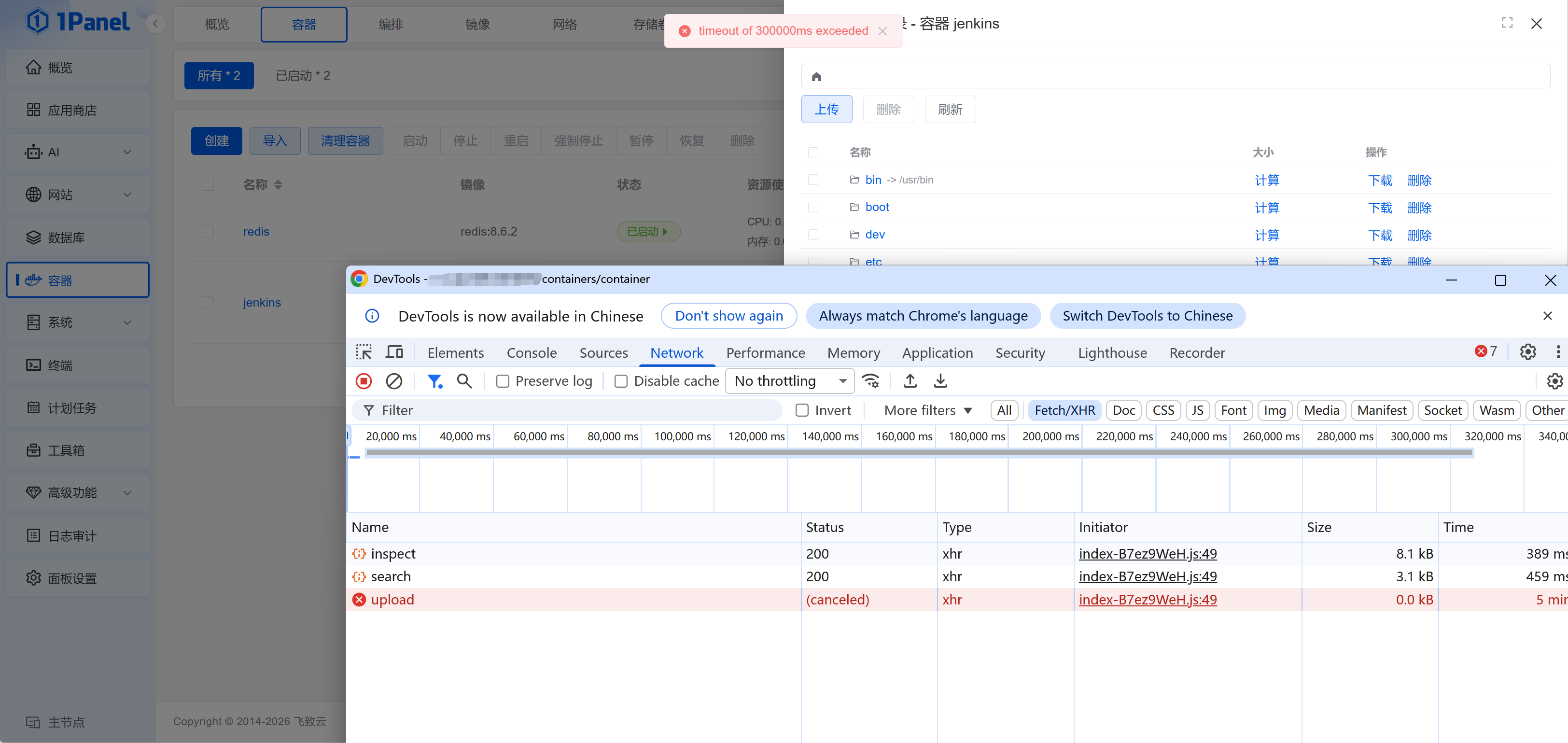 反馈问题【BUG】请附带以下信息 1Panel 版本:社区版V2.1.10 操作系统(设备): ubuntu26.04 关键截图: 日志: 上传文件到容器内超时,文件 jdk-17.0.19_linux-x64_bin.tar.gz 大小180M